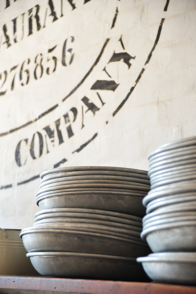 Op deze foto ziet u een stoer en industrieël geheel. De ruwe wand met de geverfde tekst geeft de sfeer van een oude fabriek. De zinken borden versterken dit beeld. Puur en simpel. Creeër deze sfeer thuis door een industriële print op te hangen en zoek zinken kopjes, bordjes et cetera en stal deze uit op planken. Simpel doch stoer.