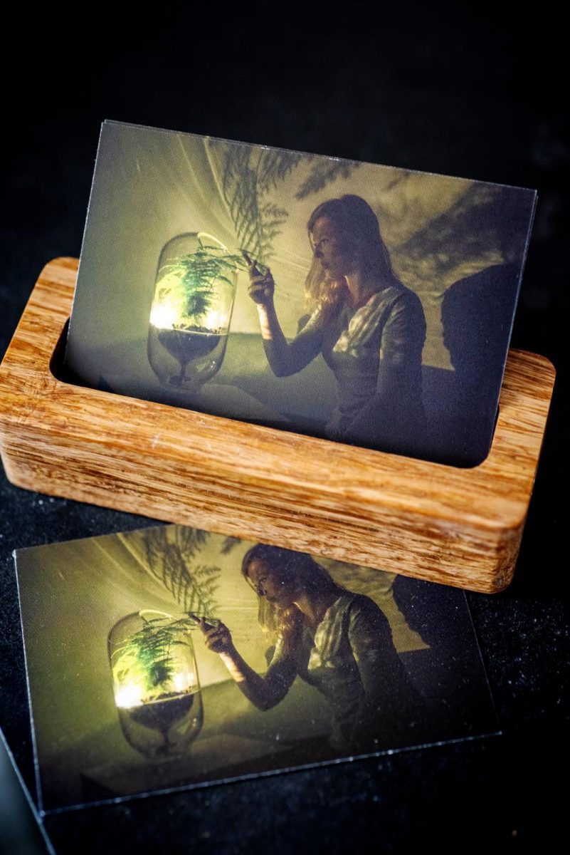 “Ik wilde verder op deze weg. Plant-e, een spin-offbedrijf van de universiteit van Wageningen gaf mij de mogelijkheid met hun technologie aan de slag te gaan: met levende planten elektriciteit maken. Planten zijn voor de meeste mensen een decoratie-object. That’s it. Natuurlijk krijgen ze water en soms een scheutje voeding, maar krijgen ze verder wel aandacht? Kijk eens echt. Elke dag weer. Verwonder je over hoe een plant zich ontwikkelt en het beste gedijt. Hoe de bladeren zich naar het licht bewegen. Ze behoren tot de oudste wezens op onze aarde, met een veel complexer dna dan wij hebben. Er valt nog zo veel te ontdekken. Geef ook eens liefde aan jouw plant en let dan op wat er gebeurt. Kom mee, we gaan even een plant aaien. Deze Spathiphyllum (lepelplant) in de glazen kom is verbonden met een biobrandstofcel. De plant geeft overtollige glucoses af en de natuurlijk voorkomende bacteriën in de grond verteren deze glucoses. Zij geven op hun beurt elektronen terug aan de biobrandstofcel. Deze cel is verbonden met elektriciteitsdraadjes aan de led-lampjes rondom de plant. Als ik zachtjes over de bladeren strijk, springen de lampjes aan. De plant geeft energie! Dit is mijn Living Light. Als ik niet goed voor de plant zou zorgen, zou ik nooit zo veel energie krijgen.”