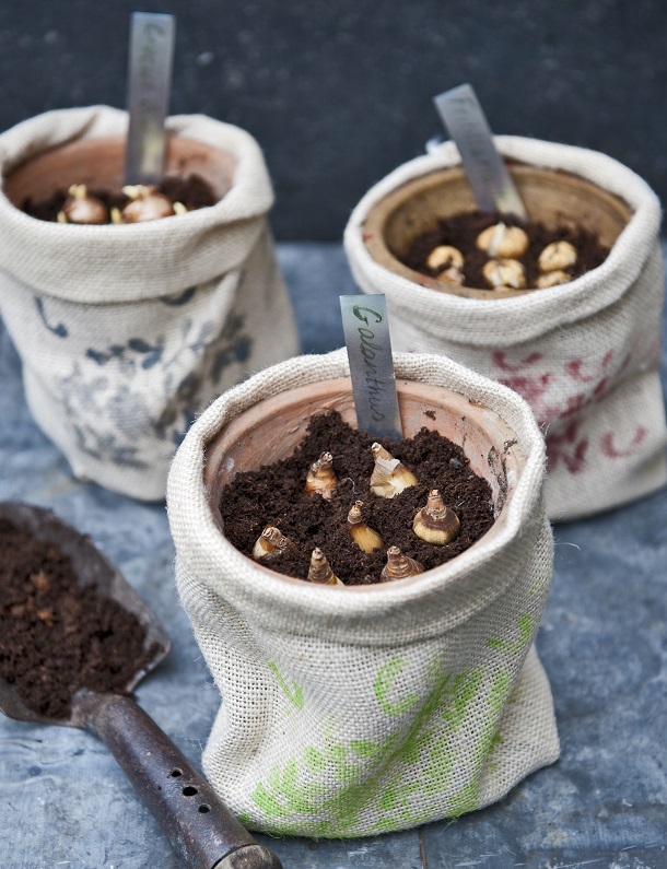 Voorjaarsbloeiers overwinteren in warm ingepakte potten