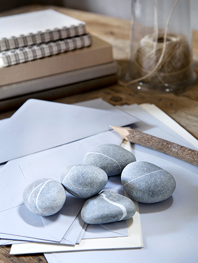 Fijn geslepen door water en zand, in oneindige kleurschakeringen, klein of groot: keitjes en kiezelstenen zijn allemaal weer anders. De mooiste stenen, gevonden op reis of tijdens een wandeling, worden thuis presse-papiers met een dierbare herinnering.