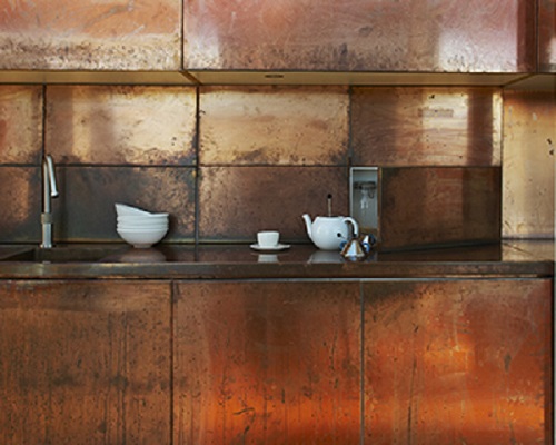 Materialen als zink en rvs worden in keukenland gebruikt voor complete keukens. Deze keuken is tamelijk bijzonder, namelijk van koper. De kastjes zijn met gepatineerd koper ingepakt. U kunt zo een bestaande keuken een heel andere uitstraling geven. Koper heeft één nadeel: het is vlekgevoelig. “Raak je gepatineerd koper vaak aan, dan verdwijnt het patina”, legt Martin van ‘Aarts Koper’ uit. “Er ontstaat gewoon blank koper. Vetvlekken zijn eenvoudig met een zacht schoonmaakmiddel of olieachtige spray als Teflon Spray te verwijderen.” Nog een punt van aandacht: koper zet uit bij warmte. “Er kan een lelijke blaas ontstaan wanneer een hete pan op het koperen aanrecht gezet wordt.” Voor een spatwand maakt Martin koper stevig vast op een dikke plaat. Zo kan het materiaal wel werken, maar blijft het in vorm ongeacht de hitte van het fornuis. Prahran Meer informatie over koper kunt u krijgen via Aarts Koper.