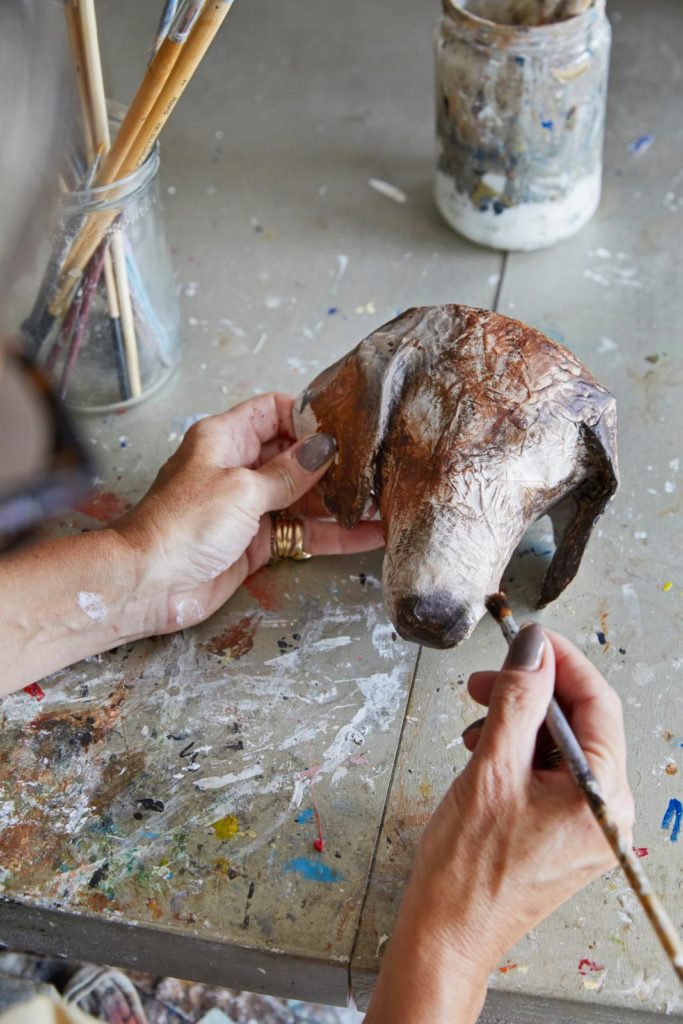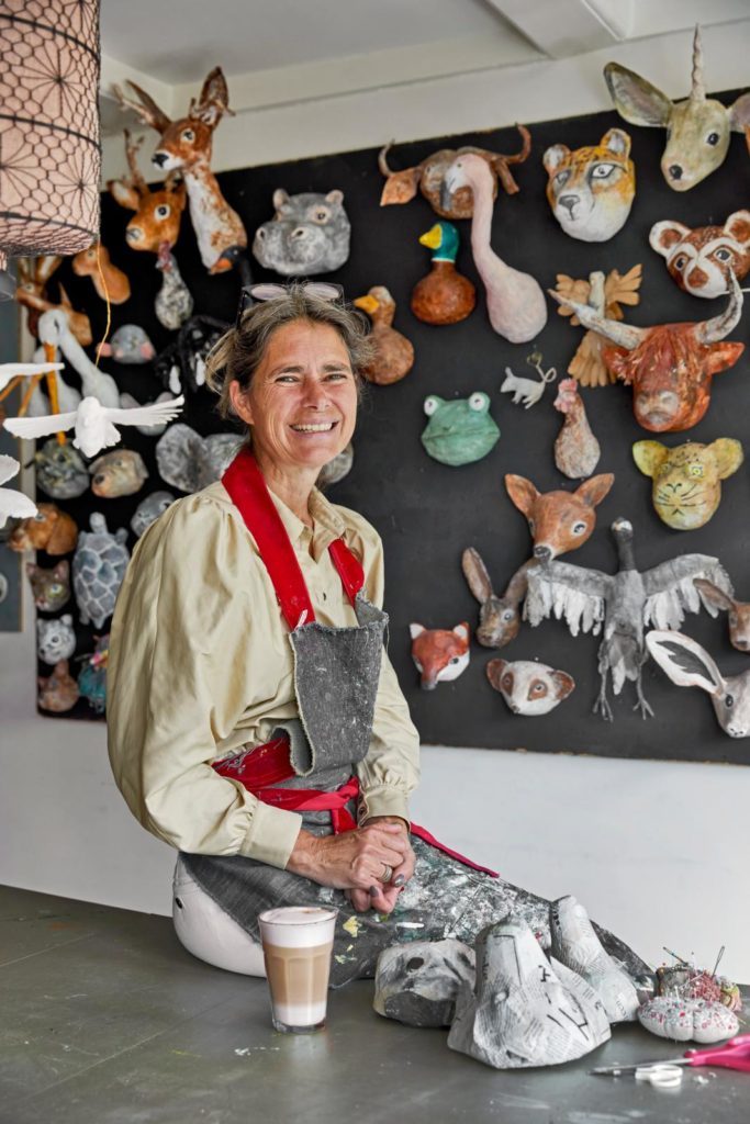 “Sinds vorig jaar word ik door de belastingdienst officieel als ‘kunstenaar’ beschouwd. Dat voelde voor mij als een diploma. Ik neem mezelf nu serieus, vind dat ik een kunstenaar ben. Daarvoor beschouwde ik mezelf meer als een mama-met- een-hobby. Papier-maché wordt nog weleens onderschat. Als ik het mensen vertel, krijg ik vaak te horen: ‘Heb ik ook weleens gedaan. Dat is niet zo moeilijk’. Maar het verenigt twee disciplines die best pittig zijn, namelijk het bouwen van vormen en schilderen. De kunst is om ze allebei te beheersen. Daarin heb ik flinke stappen gezet. Mijn eerste klanten hingen mijn werk vaak in de kinderkamer. Tegenwoordig ben ik ‘woonkamerfähig’, merk ik.”