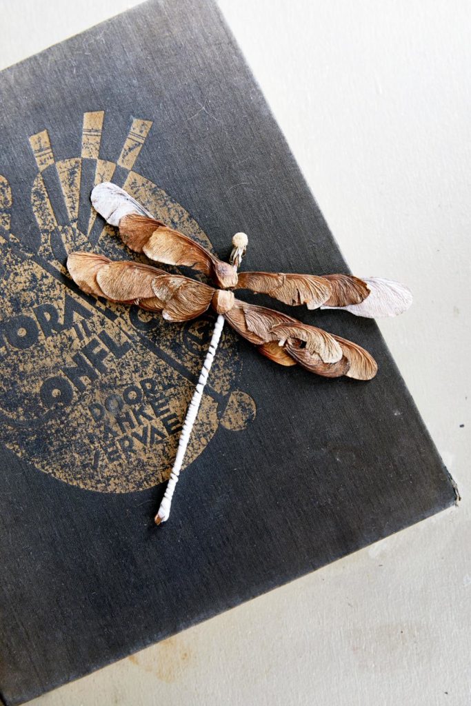 “Een papier-machédier begint vaak bij iemand die me op een nieuw beest attendeert of dat ik er zelf eentje zie. Bij mijn insecten leidt het materiaal de weg. Dan zie ik iets in een vondst. Een knoop kan een spin worden. In een lange, opgedroogde lijmdruiper zie ik het lijfje van een libelle, in de helikopterzaadjes van de es haar vleugels. Een petfles kan ik verwarmen tot een torretje en ga zo maar door. Ik schep er sowieso heel veel plezier in om alleen maar met weg- gegooide spullen te werken, om uit niets iets te maken. Dat anders kijken naar wat mensen ‘rommel’ vinden, heeft altijd in mij gezeten. Ik kan het ook niet uitzetten, m’n hoofd begint te ratelen als ik wat zie.”