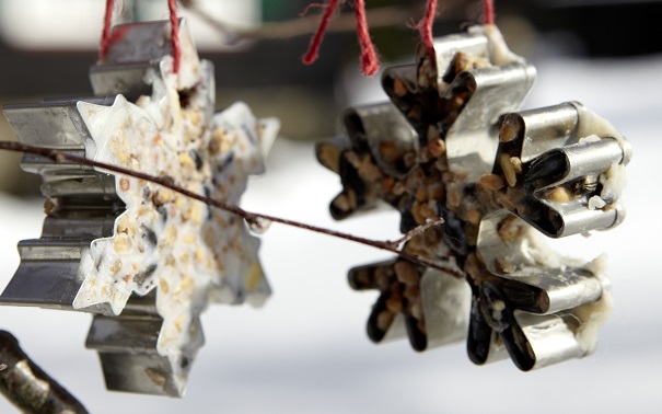 - Leg de uitsteekvormen op een bord of plank en vul ze met vogelzaadvet.