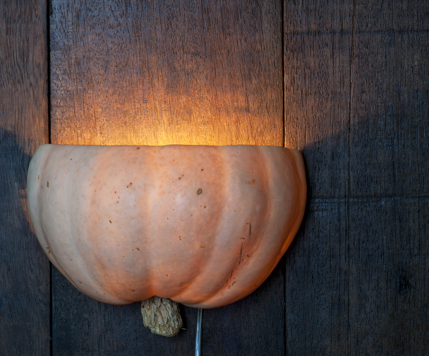 - Plaats een kleine fitting met een ledlampje in de uitgeholde pompoen.