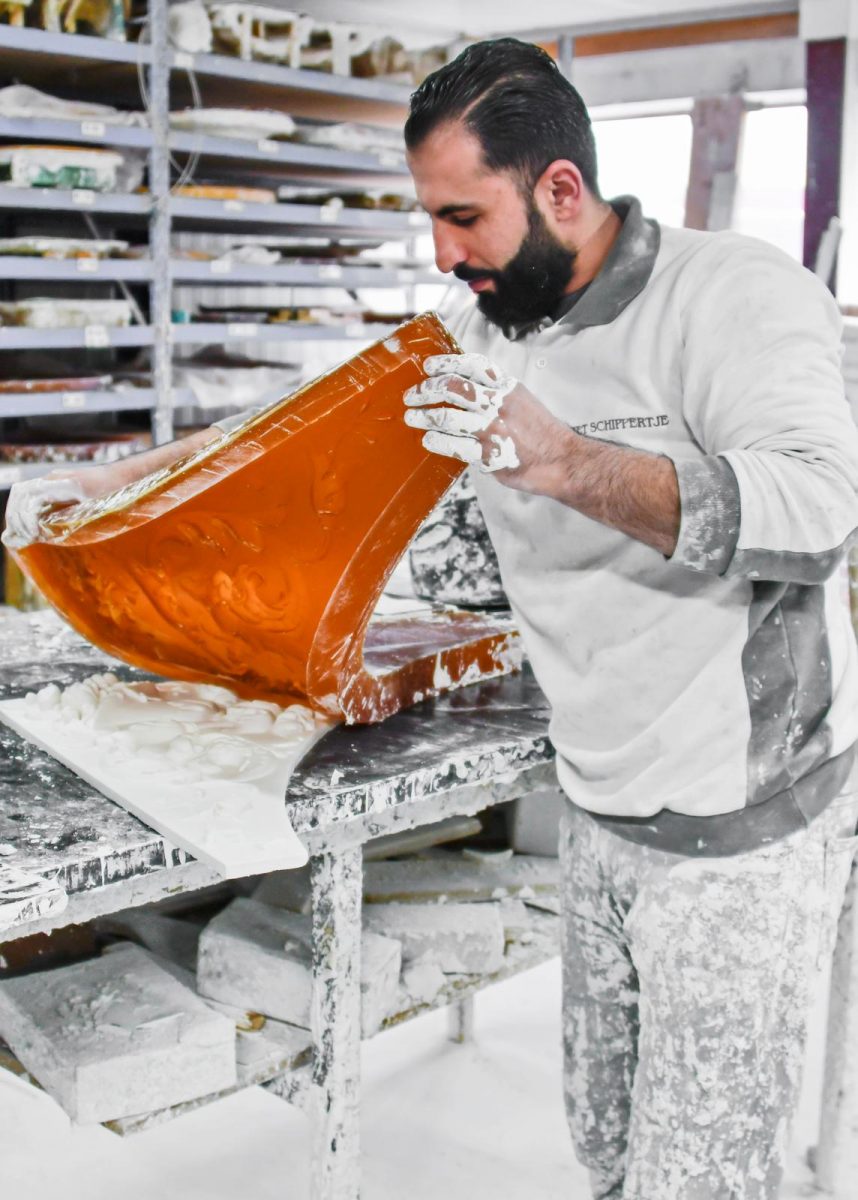 Na de koffie stappen we de witte wereld in en zitten onze schoenen in no time onder een minuscuul laagje gipspoeder. Deze betrekkelijk eenvoudige grondstof – een vermalen mineralen delfstof – wordt, vermengd met water, in vele vormen gegoten. De entreehal met een hoog, versierd plafond is meteen het parade paardje; Het Schippertje heeft hier flink uitgepakt met lijstwerk en rozetten die door het blauwe ledlicht ineens een ultramoderne uitstraling hebben. Zo imponerend kan gips zijn wanneer je het uitbundig toepast in een grote ruimte. Zodra je de trap op loopt zie je klassieke bustes en zuilen, schouwen en wandlampen en op de eerste verdieping ligt een enorme hoeveelheid sierlijsten veilig in kartonnen kokers en staan rozetten uitgestald in houten stellingen. Jeroen: “Zoals je ziet maken we lijsten en rozetten in alle vormen en maten: van klein en eenvoudig tot groot en rijk van vorm. De kleinste maat rozet van enkele centimeters koop je al voor een paar euro en kan een bescheiden ruimte net iets extra’s geven. De grootste rozet die uit één deel bestaat heeft wel een doorsnede van een meter. Grotere rozetten bestaan uit losse onderdelen die het samen tot één geheel maken. Een rozet die we ooit maakten voor een trouwzaal voor tweeduizend mensen was meters groot, heel indrukwekkend. De ring die daar omheen paste was maar liefst twaalf meter.”