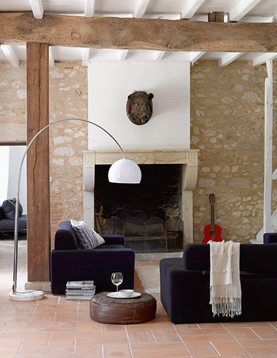 Oude en nieuwe elementen worden in deze ruimte in harmonie met elkaar samengebracht. De combinatie van oude, ruwe elementen en de nieuwe strakke meubels geven deze woonkamer een eigentijds gevoel. Fotografie: Paul Grootes, Styling: Wilma Custers