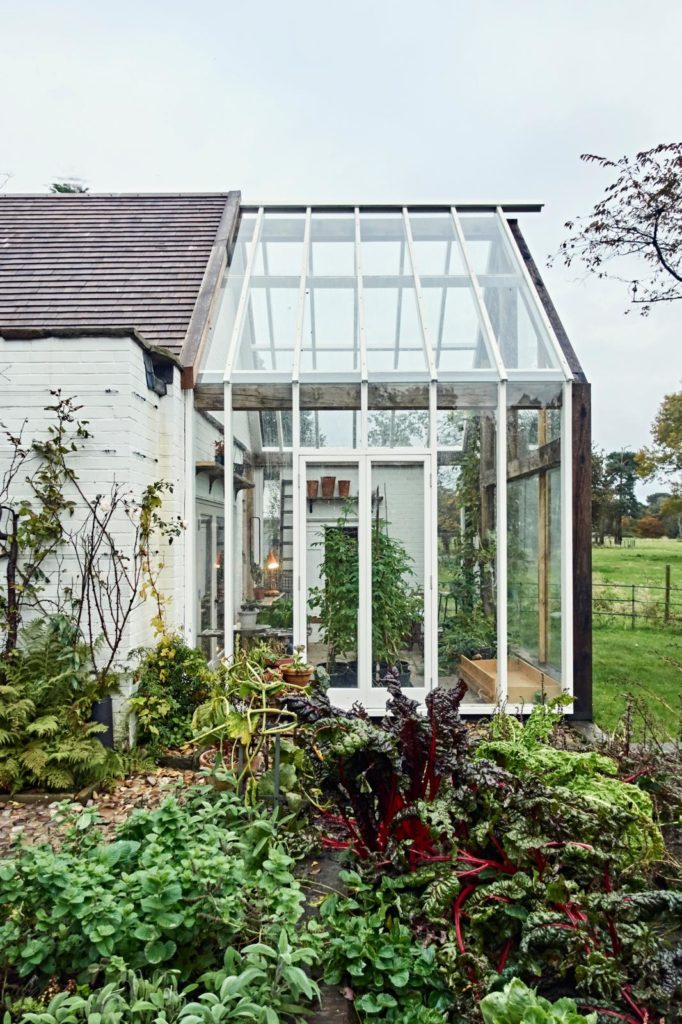 De veranda is nieuw, maar door het gebruik van zo’n eeuwenoude methode valt het nauwelijks op.” Aan de zijkant van het huis verrees een flinke conservatory, een serre. Het is een van haar favoriete plekjes. “Die verandert continu dankzij de planten en het vele daglicht.” Het was een behoorlijke puzzel, geeft ze toe, om het historisch aanzicht van de cottage te bewaren. De serre is voor het grootste deel gemaakt van staal en glas, maar aan de kopse kant van de gevel is een frame gekomen van zwartgebeitste houten balken. Op een moderne manier versmelt de aanbouw met het oude vakwerk van het huis. Grappig detail: Annabelle besloot hier nu juist voor het oppimpen van een oud meubelstuk. “Hij is antiek, de servieskast. Tussen het groen, binnen en buiten, vond ik hem te dominant worden.”