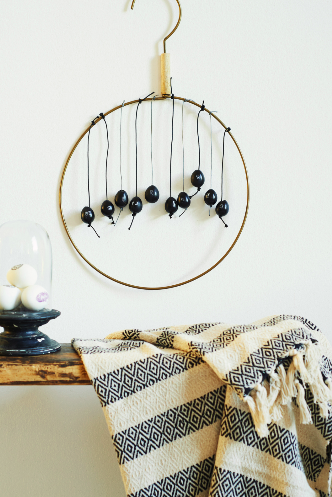- Haal ijzerdraad en touw door de eitjes en knoop ze aan de bovenrand van de hanger.