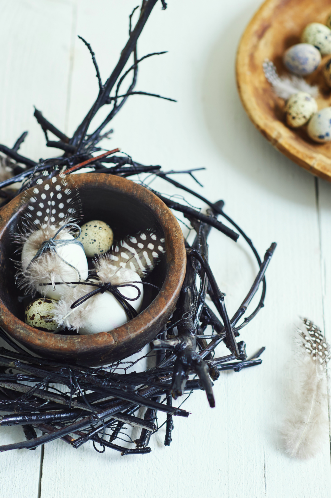 - Zet er een schaaltje met eieren en veren naar keuze in.