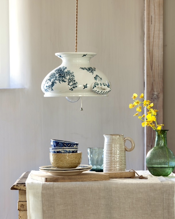 Soepterrine € 85 en bordjes Burgenland € 6 p.st. (Serviesmerij). Metalen fitting met trekschakelaar € 12 (Zangra). Houten tafel € 125 en blauwe kommen €14,50 (Jolandelijk). Giorgia tafelloper met witte streep € 39 (Libecohomestores). Tafelloper naturel linnen € 14,95 en glas Smoke met groene stip groen € 3,95 (Sissy-Boy Homeland). Houten broodplank € 19,95, glazen vaasje € 12,95, aar-dewerken kan € 9,95 en lampsnoer € 6,95 p.m. (Sjakie’s). Gele kom € 1 (Steenhof). Zijden bloemen prijs op aanvraag (Jasmijn bloembinders).