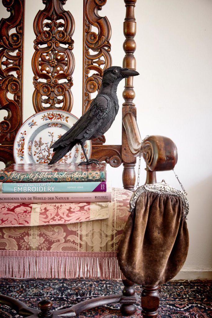 “Natuurlijk ga ik voor een mooi eindresultaat, maar het hele proces eromheen vind ik het allerleukst. Dat begint al bij het uitzoeken van de stof. Zijde vind ik mooi en fijn om mee te werken, al is het ook kwetsbaar en moet ik het soms verstevigen – dat heb ik al doende geleerd. Ook wol en linnen zijn favoriet. Ik haal het overal en nergens vandaan, maar in stoffenzaken kom ik nooit. Eerder verzamel ik het in kringloopwinkels – hier vond ik ooit een geweldig wollen krijtstreeppak waar ik kraaien en een raaf van heb gemaakt. Of een vriendin geeft me een zijden blouse die ze niet meer draagt. Tweedehands zijden sjaals heb ik ook.