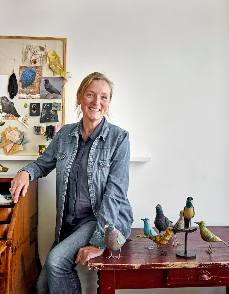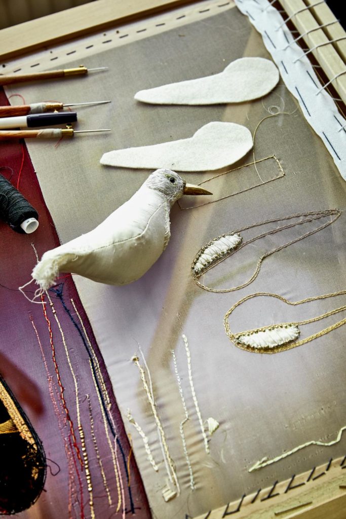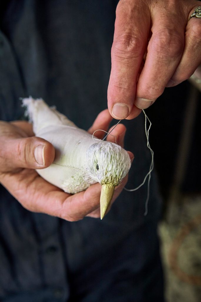 “Ik heb twee manieren. Voor de kleine vogels – tot formaat merel – heb ik een stuk of tien patronen die ik zelf heb gemaakt. Ik knip de stof en naai de delen aan elkaar. Vervolgens vul ik de vogel met wol. Daarna begint het finetunen door ze, gedeeltelijk, te borduren. Voor de grote exemplaren maak ik eerst een frame van ijzerdraad. Zo’n vogel is zwaarder en moet goed kunnen staan, vandaar. Sowieso begin ik altijd eerst met de snavel. Die snijd ik meestal uit een tak van een berk of wilg. Nadat die aan het frame is bevestigd, begint het opvullen van het lijf en het omwikkelen ervan met stof. Dat is een soort ‘beeldhouwen’ met textiel. Het borduren dat ik hierbij doe is niet alleen decoratief, ik bepaal er ook de vorm mee. Ik trek de draad flink aan, waardoor de stof strakker komt te staan, of borduur steek over steek om zo volume toe te voegen.”