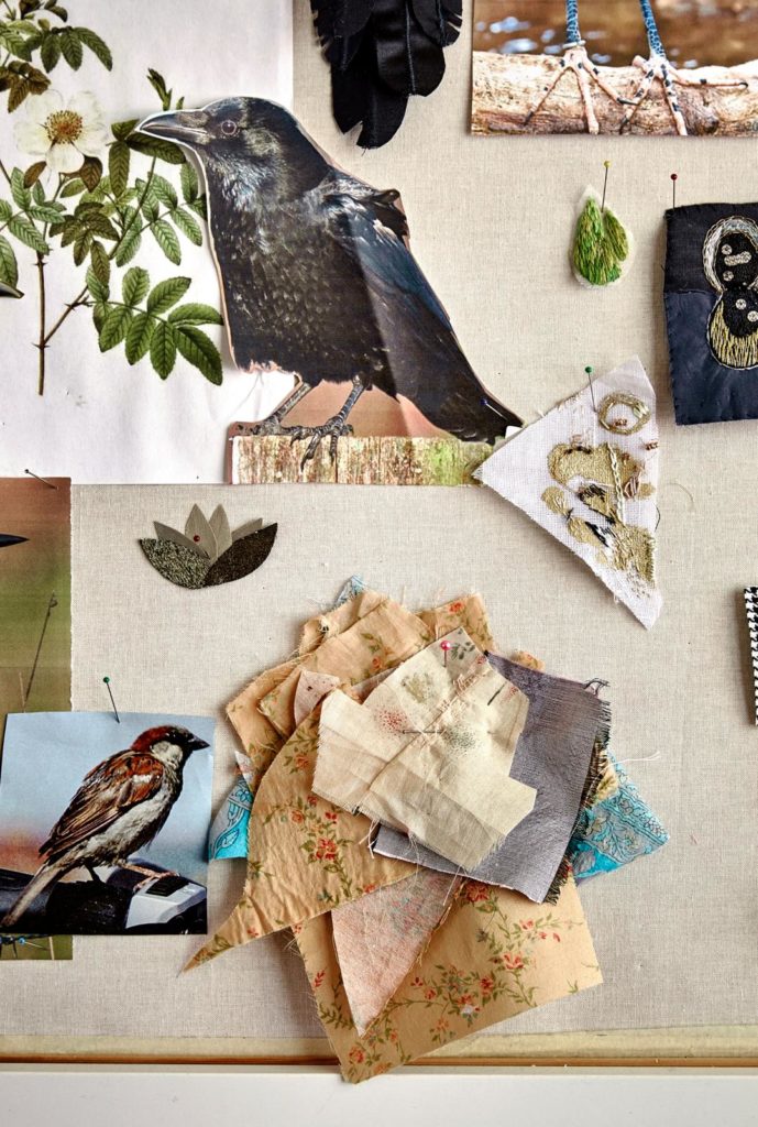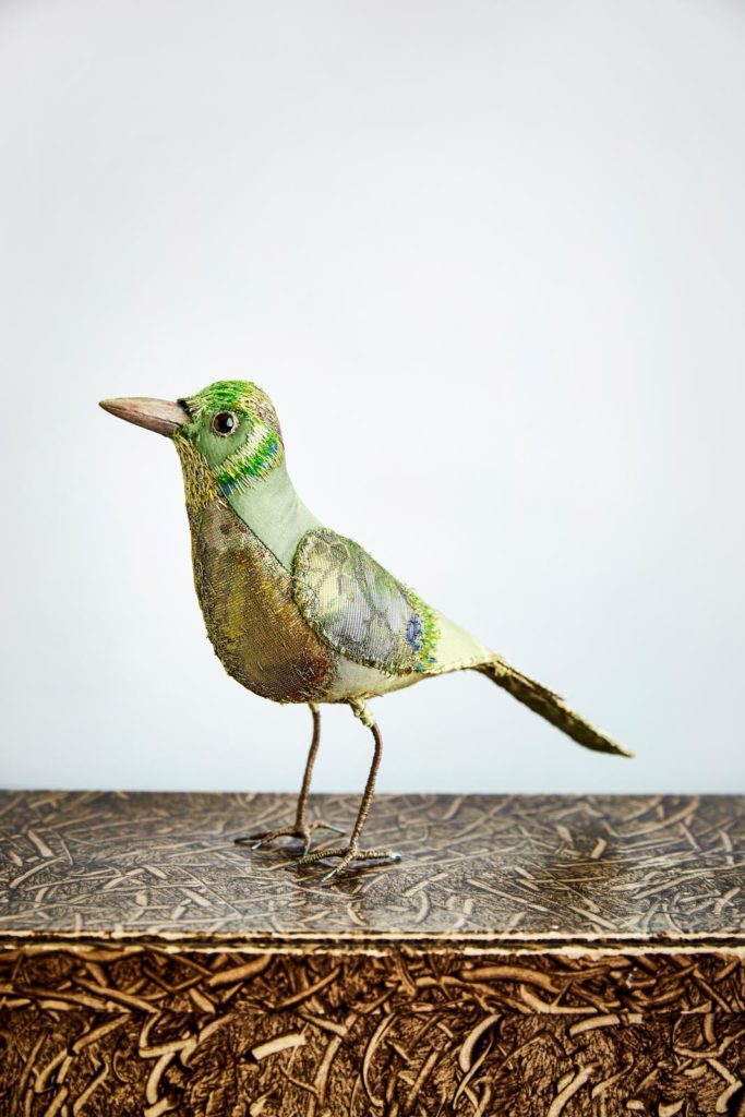 “Dat was een koolmeesje dat ik in 2016 maakte voor mijn zus. Zij is vogelaar en ik wilde haar verrassen op haar verjaardag. Via Instagram volgde ik al een poosje accounts van mensen die geweldige dingen doen met stoffen en borduren: textielkunstenaars als @misterfinchtextiles, @zazamerrick en @karennicol1. Ik had even daarvoor een partij kussenhoesjes van dupion-zijde op de kop getikt, met het idee daar iets mee te gaan doen. Geïnspireerd door Instagram dacht ik: laat ik eens proberen een vogel te maken. En die lukte best aardig.”
