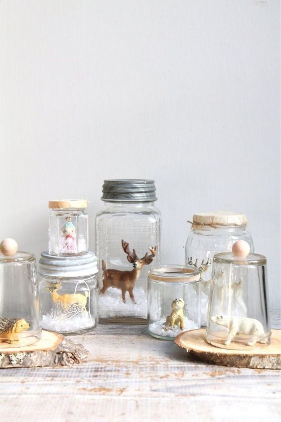 Je zult zien dat je niet meer kunt stoppen als je eenmaal bezig bent, zo leuk is het om zelf een sneeuwbol te maken. (Van een jampot of andere goed afsluitbare glazen potten.) Komt goed uit, want dan heb je meteen originele kerstcadeautjes. Hou er zeker een paar zelf en zet ze als groepje in de vensterbank of op tafel waar ze met elkaar een sprookjesachtig tafereel vormen.