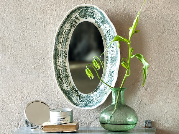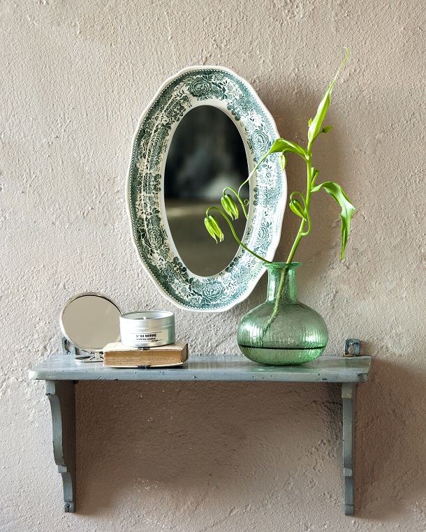 Serveerschaal middelgroot Burgenland groen € 17,50 (Serviesmerij). Groen vaasje € 10,95 (Sjakie’s). Console € 17,95, boekje € (Jolandelijk). Ronde spiegel € 22,95 en geurkaars in blik € 6,95 (Sissy-Boy Homeland). Bloem € 4,50 per tak (Jasmijn Bloembinders).