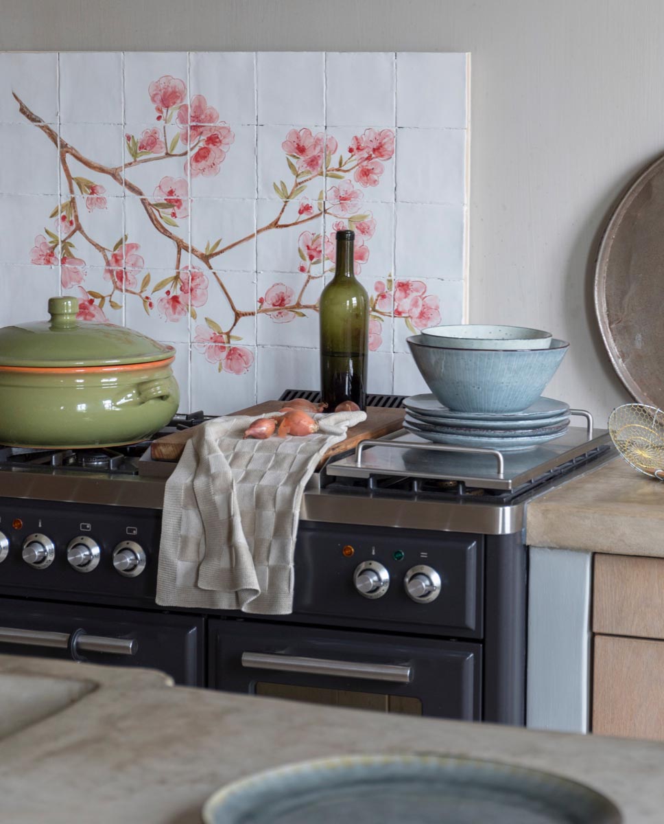 Speciaal voor Seasons maakte Bea Peters van 1000 graden dit nieuwe ontwerp voor een tegelwand. Een prachtige bloesem-illustratie, met de hand geschilderd en daarna geglazuurd. Je kunt kiezen uit Cottoceramix of witte Mosa.