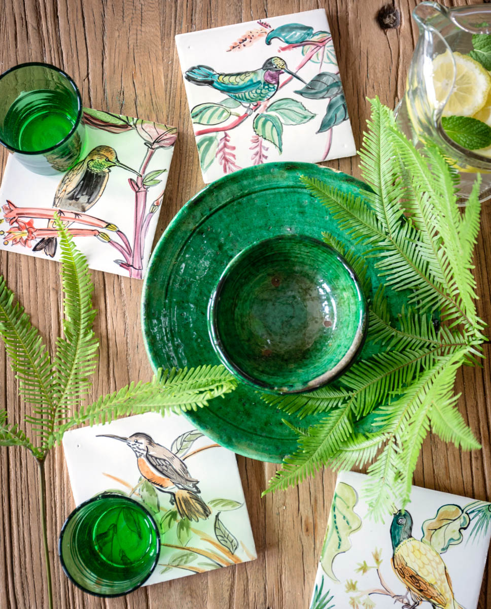 Deze tegels zijn handbeschilderd met 4 verschillende exotische kolibries. Mooi om los op te hangen of bijvoorbeeld te gebruiken als luxe onderzetters. Materiaal: hoge kwaliteit tegels van Cottoceramix Afmeting: 13 x 13 cm per stuk Prijs: € 140 euro per 4 stuks De unieke tegels zijn stuk voor stuk met de hand beschilderd. En te koop via onze webshop. PRODUCTIE LINDA PIJPER | FOTOGRAFIE ALBERT ROOSENBURG | STYLING ANNELIES MORRIS | ASSISTENT STYLING MEIKE BOLLEN