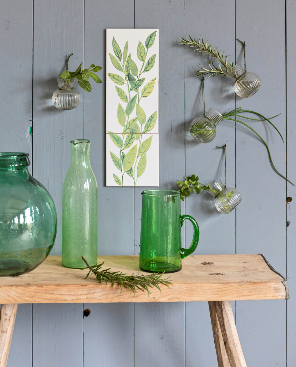Dit tableau van frisgroen blad plak je zo op de muur. Of op hout of glas. Ook leuk als fris accent tussen neutrale tegels. Materiaal: hoge kwaliteit Mosa tegels Afmeting: een pakket met 3 tegels van 15 x 15 cm per stuk. Inclusief dubbelzijdige plaknoppen om ze op te hangen. Prijs: € 60