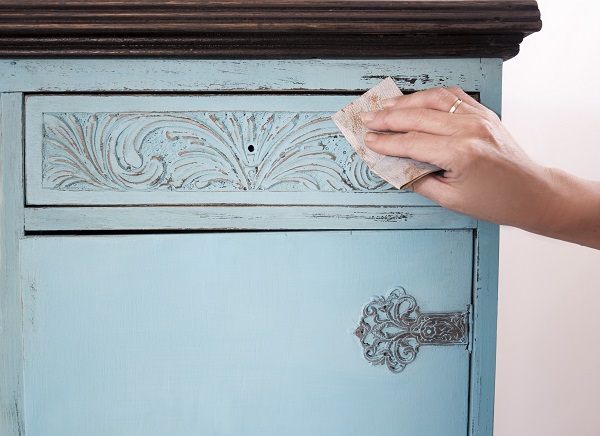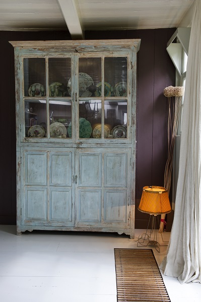 De fraaie, blauwe servieskast in het huis van Marianne Molière uit Seasons Wonen heeft een antieke, verweerde uitstraling. Dit komt door de krijtverf Pale Jeans (44) van Aboondanza, die zo is aangebracht dat hij geschuurd lijkt. In deze werkbeschrijving leest u hoe u eenvoudig zelf de antieklook creëert. Wilt u Seasons Wonen bestellen? Klik dan hier!   antiekblauwekast1. De voorbereiding Het antiekeffect komt het best tot zijn recht op hout. Ontvet de ondergrond grondig, verwijder oude waslagen en schuur gladde laklagen een beetje op tot ze dof zijn. 2. Slijtplekken creëren Breng kaarsvet aan op de plaatsen waar een verweerd effect wenselijk is, zoals op de randen en hoekjes, of op delen met reliëf. Het kaarsvet voorkomt dat de verf goed hecht. U kunt ook boenwas gebruiken, laat dit dan wel eerst even uitharden. 3. Verf aanbrengen Breng een laag krijtverf aan in de kleur Pale Jeans (440) van Abbondanza. Voor een nonchalant en niet te strak effect mag dit best hier en daar wat minder goed dekken. Zorg ervoor dat de verf uitgestreken wordt in één richting, bij voorkeur in de richting van de nerven van het hout. Dit geeft een rustiger beeld. 4. Doorschuren Als de verflaag droog is, maar nog niet uitgehard (dit is na ongeveer een uurtje), kan de verf geschuurd worden op de plaatsen waar u kaarsvet heeft aangebracht. Dit kan met een stukje middelfijn schuurpapier, fijne staalwol of een schuurspons. 5. Patineren Geef de verflaag ten slotte nog een mooi patina. Dit kan met antiekwas of verniswas op waterbasis van Abbondanza. Hiermee tempert u het blauw, zodat de kast een zachte en doorleefde uitstraling krijgt. Het laagje was beschermt meteen ook tegen vlekken. Kijk voor nog meer inspiratie op abbondanza.nl of verftechnieken.nl. Tekst: Mirjam Steenbeeke