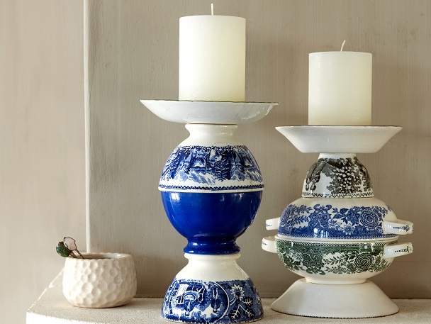 Beige kom € 3,50 (Durf!). Lepeltjes met steen € 0,50 p.st. (Steenhof). Stompkaarsen € 3,50 p.st. (Sissy-Boy Homeland). Kandelaars v.l.n.r. en v.b.n.b.: schotel € 1 (Steenhof). Antieke blauwwitte kom € 19,95, antieke blauwe effen kom € 6,95, antieke blauw-witte kom € 12,95 (Jolandelijk). Schotel € 1 (Steenhof). Antiek kopje zwart-wit € 6,50 (Jolandelijk). Soepkom (met schotel) Burgenland blauw en groen € 8,50 p.st. (Serviesmerij.nl). Schotel € 1 (Steenhof).