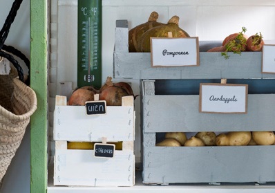 Waar gaan we heen met onze wintervoorraad? Kistjes van de groenteboer of een keukenkastje, gered van de sloop, zijn perfect als voorraadkast. Want weckpotten met gedroogde kruiden of peulvruchten uit eigen moestuin mogen best gezien worden. Gebruik bijvoorbeeld eenvoudige houten (sinaasappel)kistjes van de groenteboer. Schilder de kistjes met verf op waterbasis. Schrijf of print de fruit- en groentenamen op wit papier en plak ze op stevig karton. Bevestig de etiketten met hout- of kartonlijm met een wasknijper op de kistjes. Fotografie: Rob van der Vet Styling: Paula Schouten