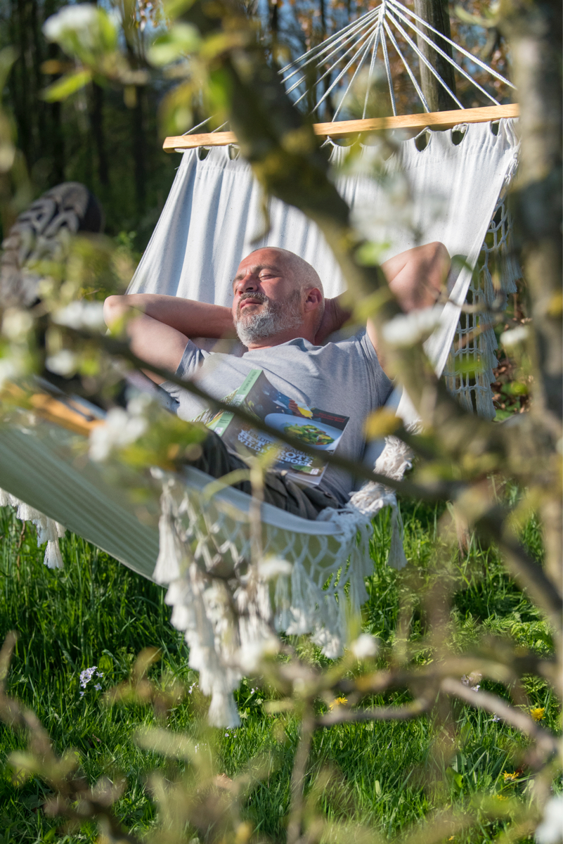 En plukken moet je in de ochtend doen, dan staan de kruiden nog strak van de nacht. Net als mensen, die zijn ‘s avonds ook moe als de zon de hele dag op hun bolletje heeft gestaan. Als ik om half zeven in de beek waterkers sta te plukken, de vogels fluiten, de zon komt door het groen, het is achttien graden, de watertemperatuur is hooguit zeven, ik heb het warm en koud tegelijk, dat is voor mij de essentie van zijn. En als ik dan aan het eind van de dag besluit dat ik het belangrijkste voor die dag gedaan heb, hang ik nog een uurtje in de hangmat. Dan is het leven mooi.”