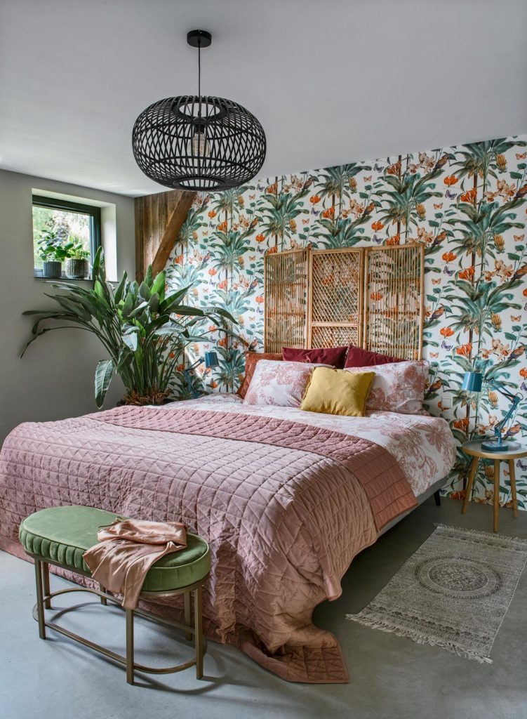 De Strelitzia (hier lees je alles over de paradijsvogelplant) in pot brengt het behang tot leven.