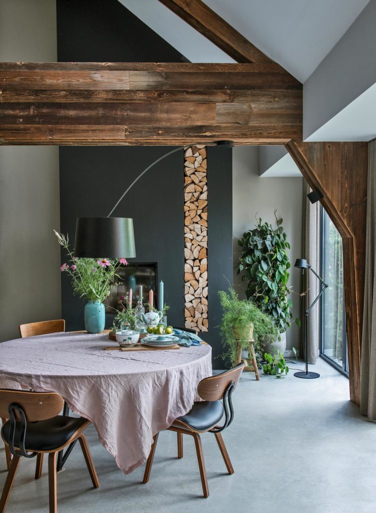 De stalen bouwconstructie in de woonkeuken werd bekleed met barnwood uit Oostenrijk. De ronde tafel is gemaakt door Löwik Meubelmakerij. De stoelen zijn van Dutchbone, servies Joli is van Pip Studio.