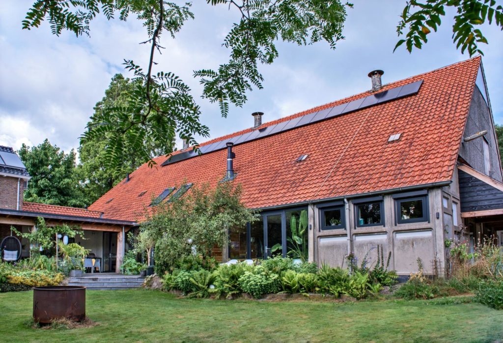 Wonen verbinden met de natuur heeft ook een diepere betekenis voor Judith en Gerwin: duurzaamheid staat hoog in hun vaandel en was een belangrijke leidraad bij de verbouwing. Ze verbruiken amper gas meer, installeerden zonnecollectoren, een warmtepomp en een groot buffervat voor water. “Waar mogelijk hebben we materialen hergebruikt, zo heeft Gerwin de buitenkeuken getimmerd van hout dat nog in de schuur lag.”