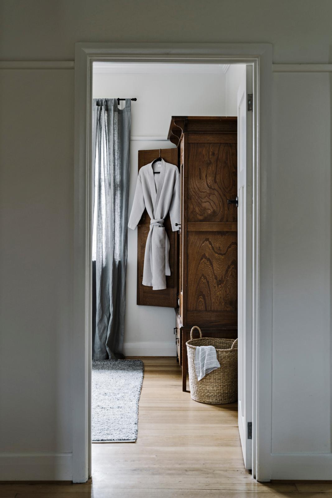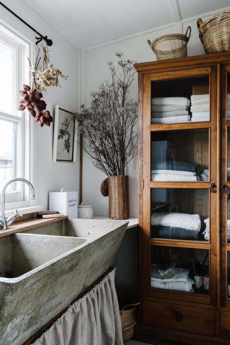 De betonnen wasbak kwam letterlijk op het pad van Matt en Gemma. “Tijdens een wandeling spotten we ’m als sloopafval in de berm, op een plek waar ze aan het verbouwen waren.” Je vindt zulke hardstenen troggen nog weleens bij een handelaar in oude bouwmaterialen, zoals Jan van IJken (oudebouwmaterialen.nl), Piet Jonker of ’t Achterhuis. De linnenkast vond ze op Gumtree, de Australische Marktplaats. “Hij is heel degelijk, vier mannen moesten hem naar binnen dragen!”