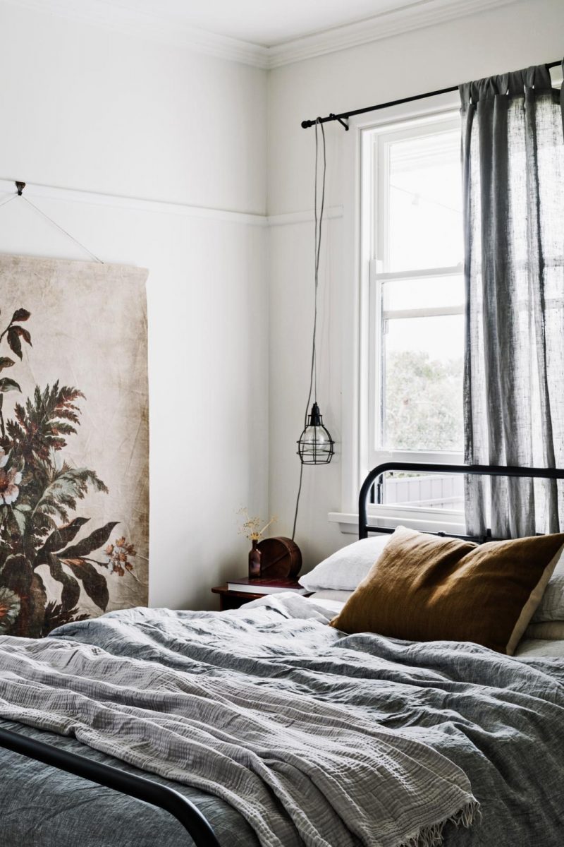 Het cosy huis heeft twee slaapkamers. “De bedspreien en gordijnen zijn van Frans linnen. Textiel in een bleke oceaanblauwe tint past perfect bij antieke meubels.” Opvallend zijn de planten en botanische prints, die overal in het huis aanwezig zijn. “Mijn eerste baan was bij een bloemist. Misschien komt het daardoor.” De poster is van HK Living. Vergelijkbaar linnen beddengoed en kussen via By Mölle.