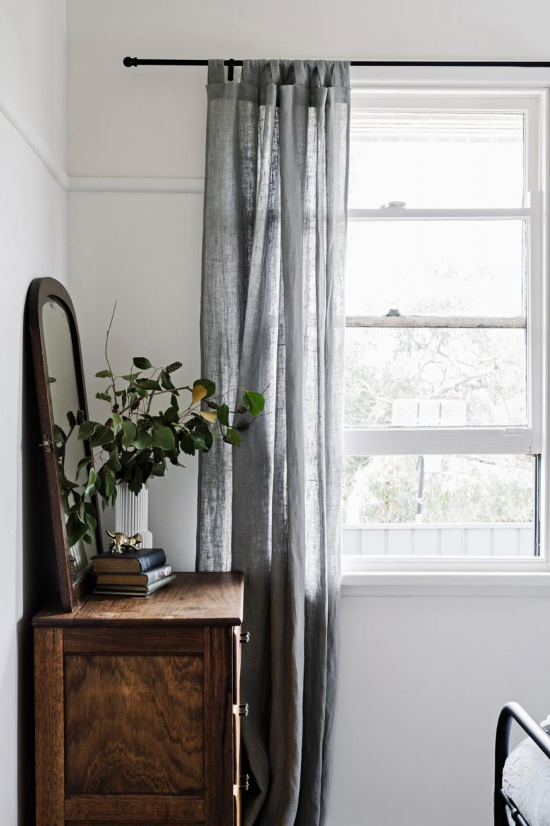 Ook in de andere slaapkamer staat antiek. “Oud meubilair straalt vakmanschap uit. Het dressoir kocht ik op eBay. De spiegel, zo’n honderd jaar oud, kreeg ik als verjaardagscadeau van een vriendin.” Vergelijkbare gordijnen heeft H&M Home.