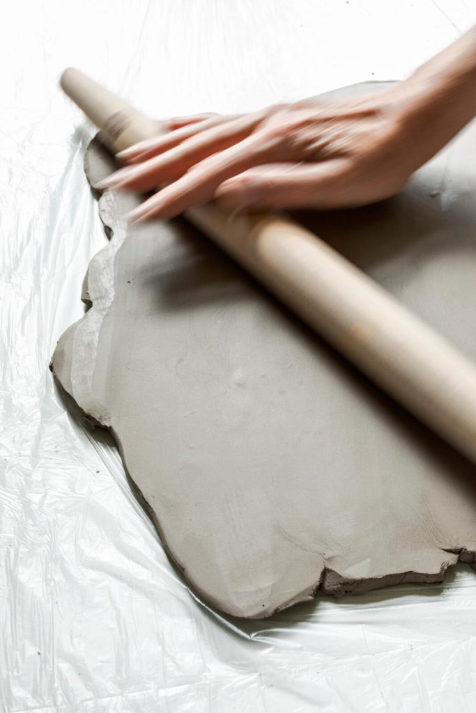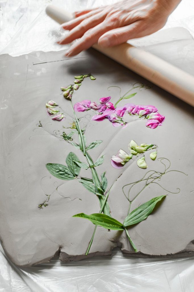 - Rol de klei uit zodat hij iets groter is dan de gietmal. Om een mooi reliëf te krijgen, moeten de plantendelen er een beetje worden ingedrukt – soms dieper en soms wat lichter. Houd daarom zeker 2-3 cm aan.