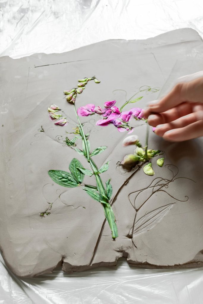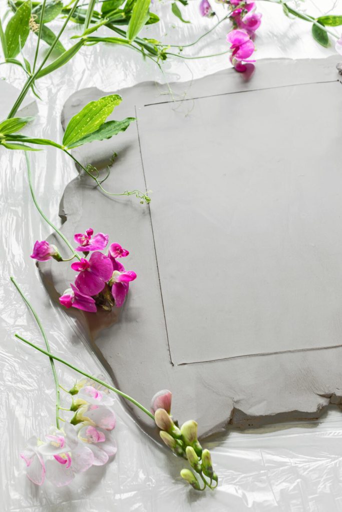 - Maak een compositie van de bloemen en plantendelen op de klei. Zorg ervoor dat de bladeren en bloemen mooi uitgewaaierd zijn en geen knikken hebben.