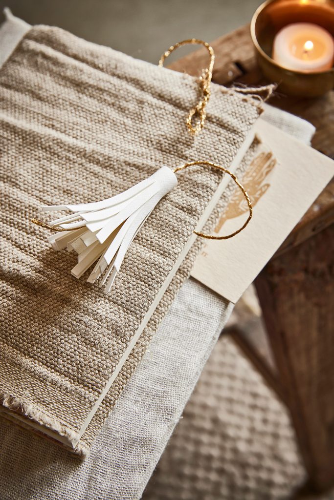 Gebruik het kwastje als boekenlegger. Het boek op de foto is zelf gekaft met een stuk linnen, op dezelfde manier als je kaft met papier (zoek online naar een tutorial). Gebruik daarvoor een restje linnen of een oude linnen theedoek.