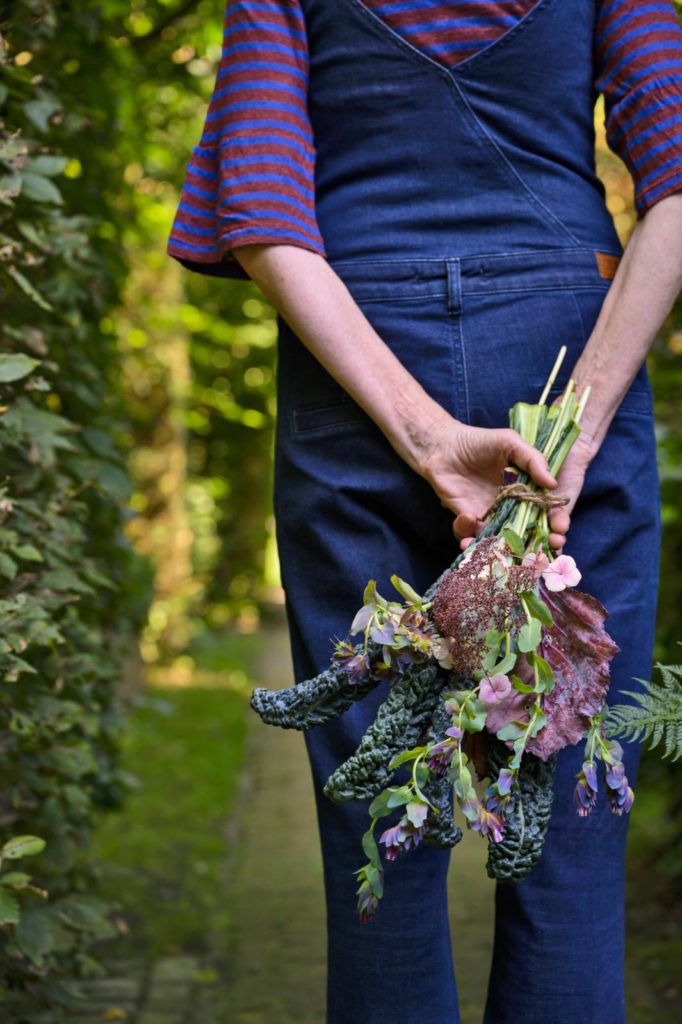 Het is niet heel gebruikelijk om groenten in je boeket te verwerken, maar kijk eens hoe verrassend mooi deze cavolo nero uitkomt in dit gradiëntboeketje (dat wil zeggen dat de tinten verlopen). Het stevige, vlezige blad met zijn opvallende structuur en blauwgrijze waas is niet alleen lekker, maar ook prachtig.