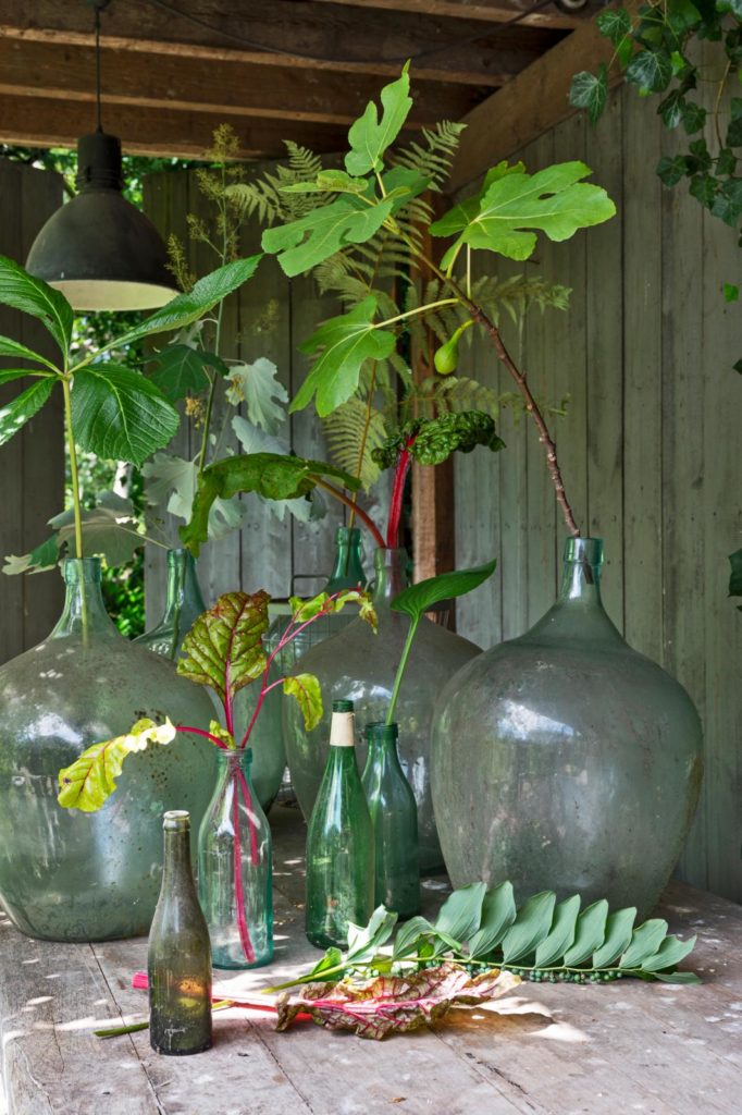 - Kies een grote flesvaas met lange hals. Bij zo’n vaas passen langere takken en bloemen in combinatie met een mix van fijner en grover blad.